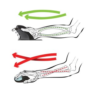 - Easy-glide symmetrical base – Allows the user to rest either hand comfortably alongside the vertical structure, encouraging the use of the bigger muscles in the fore and upper arm to maneuver the mouse. Fine cursor control is still achievable with small hand and/or finger movements