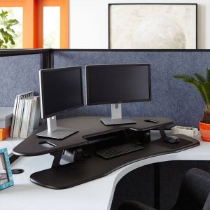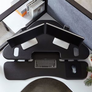 - Two decks: top display surface for monitors, and a lower keyboard/mouse deck.